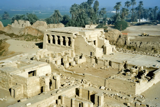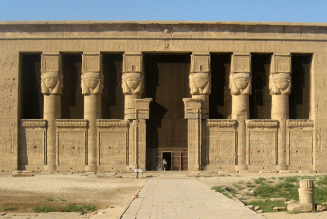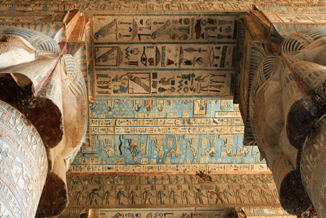 Situé à environ 70 km au nord de Louxor, Le temple, situé sur la rive gauche du Nil, à quatre kilomètres en face de la ville de Qena. La construction du temple de Dendérah fut commencée à l’Époque ptolémaïque et romaine, au début de notre ère. Le temple est consacré à Hathor, fille de Rê, maîtresse des lieux, déesse de l’amour, du désir et de la joie, ainsi que de la musique. Le plafond de la salle hypostyle, divisé en sept travées par des architraves, supporte des représentations astronomiques : le trajet diurne du soleil, le trajet nocturne de la lune, les décans, les douze heures du jour et de la nuit. Le long des murs, le corps de la déesse du ciel Nout s’étire démesurément car elle avale le soleil au crépuscule et le met au monde à l’aurore. L’astronomie était liée au culte d’Hathor, les prêtres suivaient avec attention le gouvernent des étoiles de façon à établir un calendrier précis des fêtes religieuses.